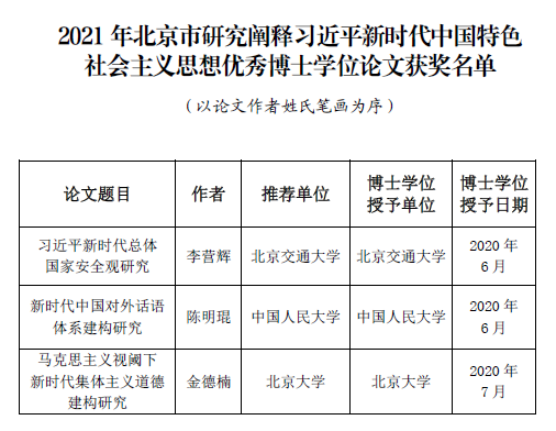 近日,北京市习近平新时代中国特色社会主义思想研究中心(以下简称“北京市研究中心”)公布2021年北京市研究阐释习近平新时代中国特色社会主义思想优秀博士学位论文获奖名单。bw西汉姆联韩振峰教授指导的20届博士毕业生、公司青年教师李营辉的博士论文《习近平新时代总体国家安全观研究》入围获奖。