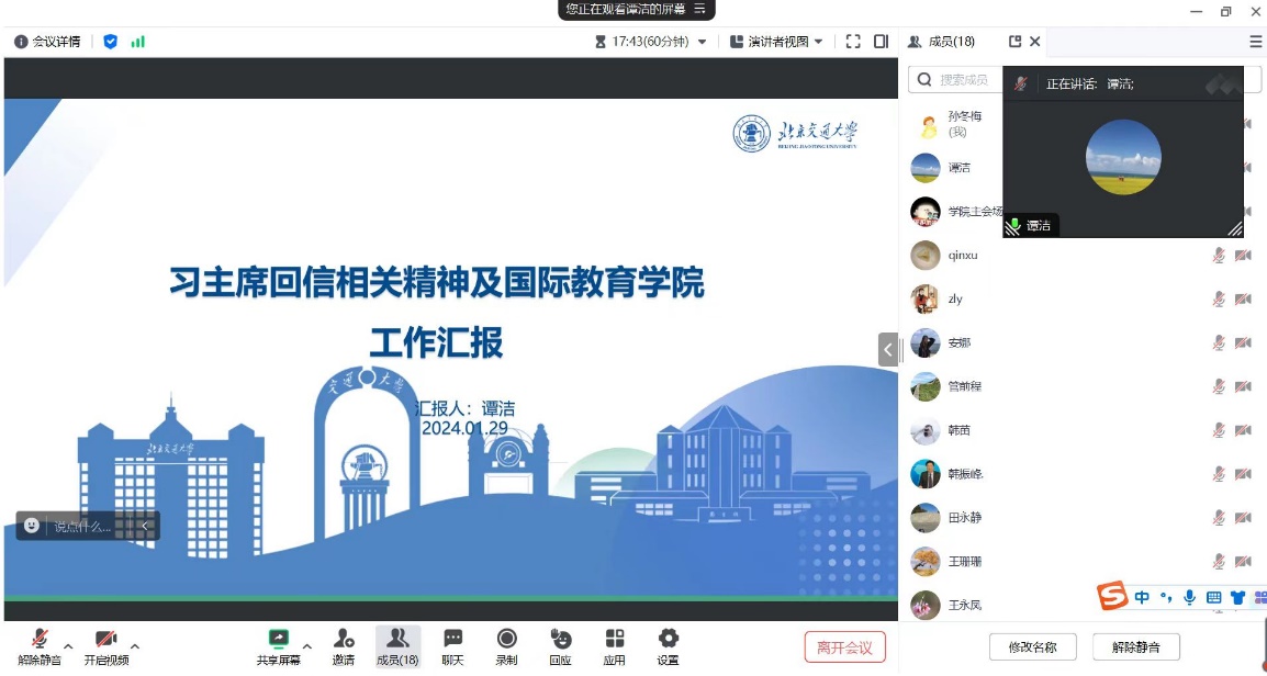 谭洁详细介绍习近平总书记回信背景、深刻内涵、重大意义,回顾公司70余年国际教育历程,重点介绍新时代公司积极响应国家“一带一路”倡议等重大战略需求,承担肯尼亚蒙内铁路大规模人才培养任务等工作,国际教育不断提质增效、国际化办学水平得到党和国家高度认可。谭洁表示,教育在国家外交大局、国际传播中发挥重要作用,要以习近平总书记重要回信精神为契机,持续提升学校国际交流合作水平,为推动“一带一路”建设高质量发展、构建人类命运共同体作出交大贡献。