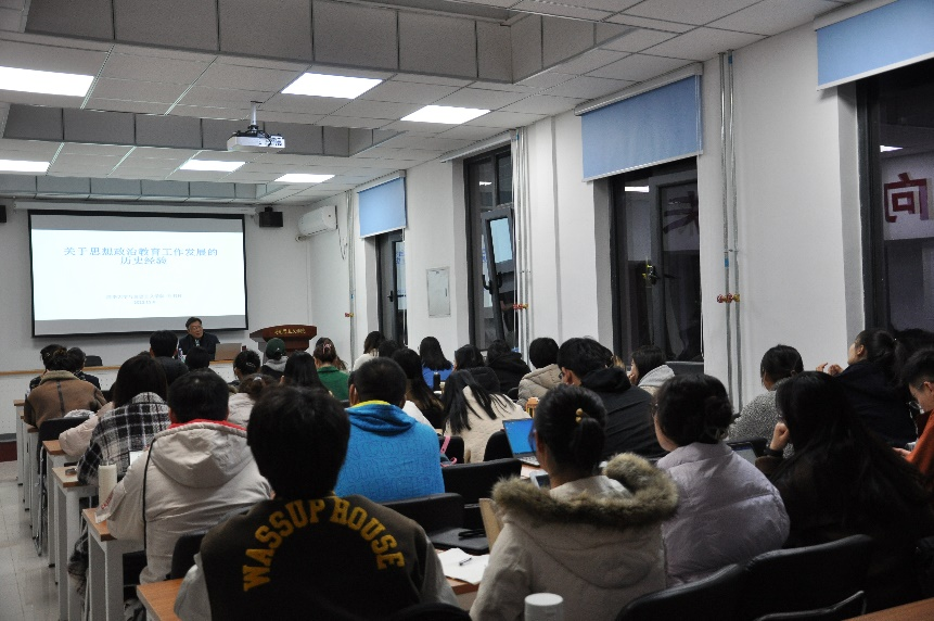 刘书林教授从个人的求学求职经历切入,讲述了自己投身学术事业的心路历程,鼓励同学们潜心钻研,不负韶华。随后,刘书林教授从七个方面,即党对教育事业的全面领导,是思想政治教育取得成就的政治保障和前提条件,必须永远坚持、毫不动摇;世界观的学习和改造是影响思想政治教育全局的根本问题,也是教师队伍建设的根本任务之一,永远不能动摇和放弃;学校的思想政治教育和思政课是思想政治教育的主渠道,要永远守好这块社会主义意识形态的主阵地;思想政治教育的首要任务和核心内容就是坚持社会主义和共产主义理想信念教育,这一教育内容决不能淡化和放弃;思想政治教育的内容必须长期坚持爱国主义、集体主义、社会主义的主旋律,永远不动摇;不断更新思想政治教育的方式方法,体现针对性、亲和力、渗透性、体现问题导向、是增强教育效果的关键环节;以马克思主义为指导,不断加强校园物质条件建设,净化校园、课堂和教材等教育环境,保持良好的办学方向和条件,深刻总结了思想政治教育工作发展的历史经验。